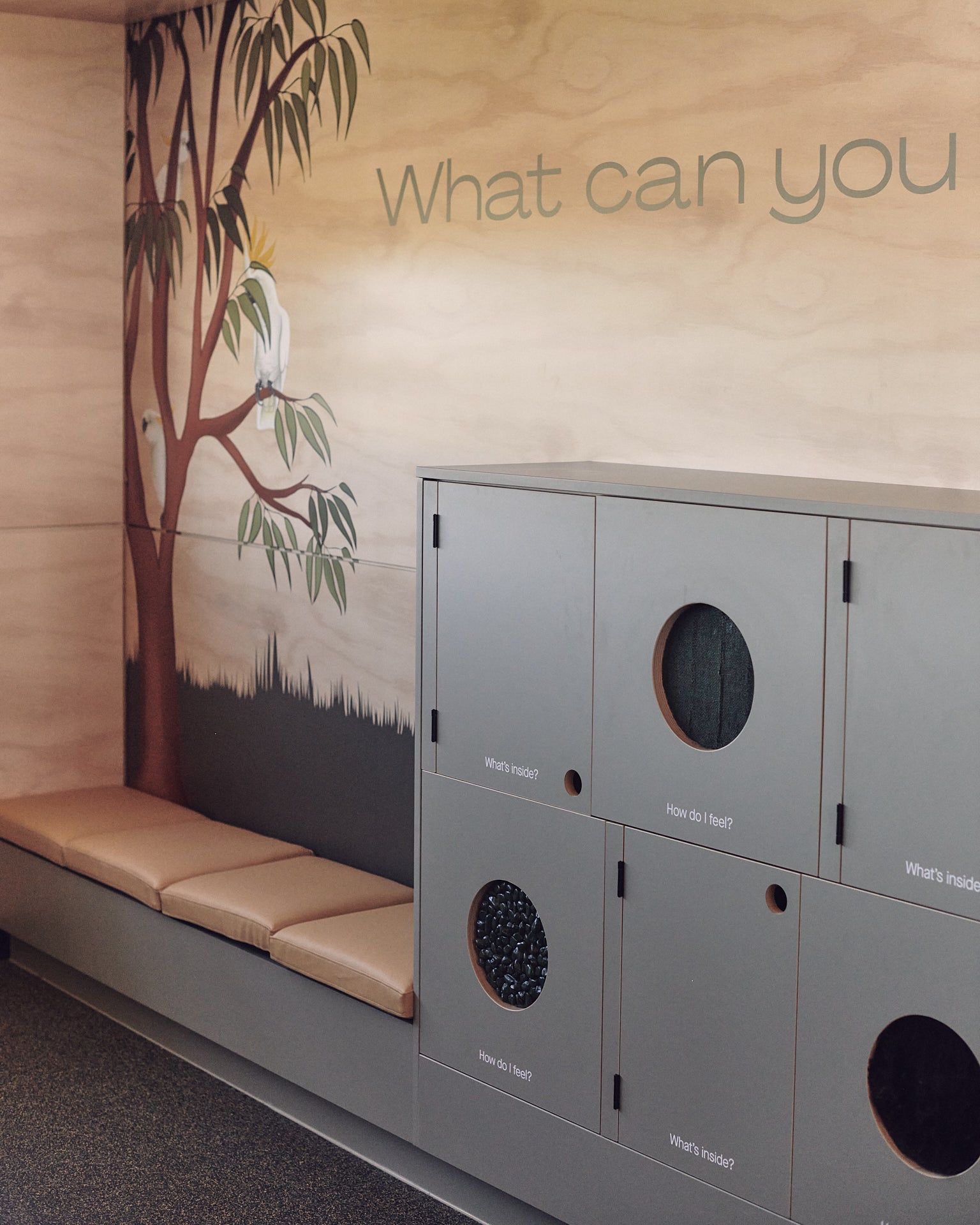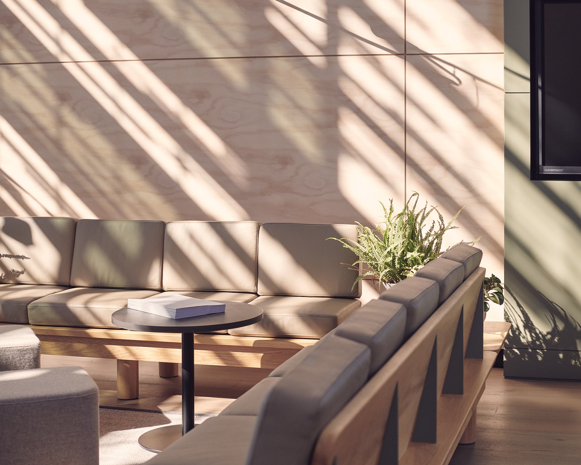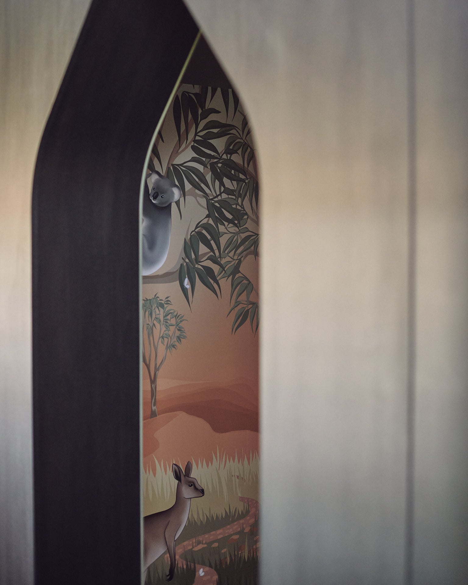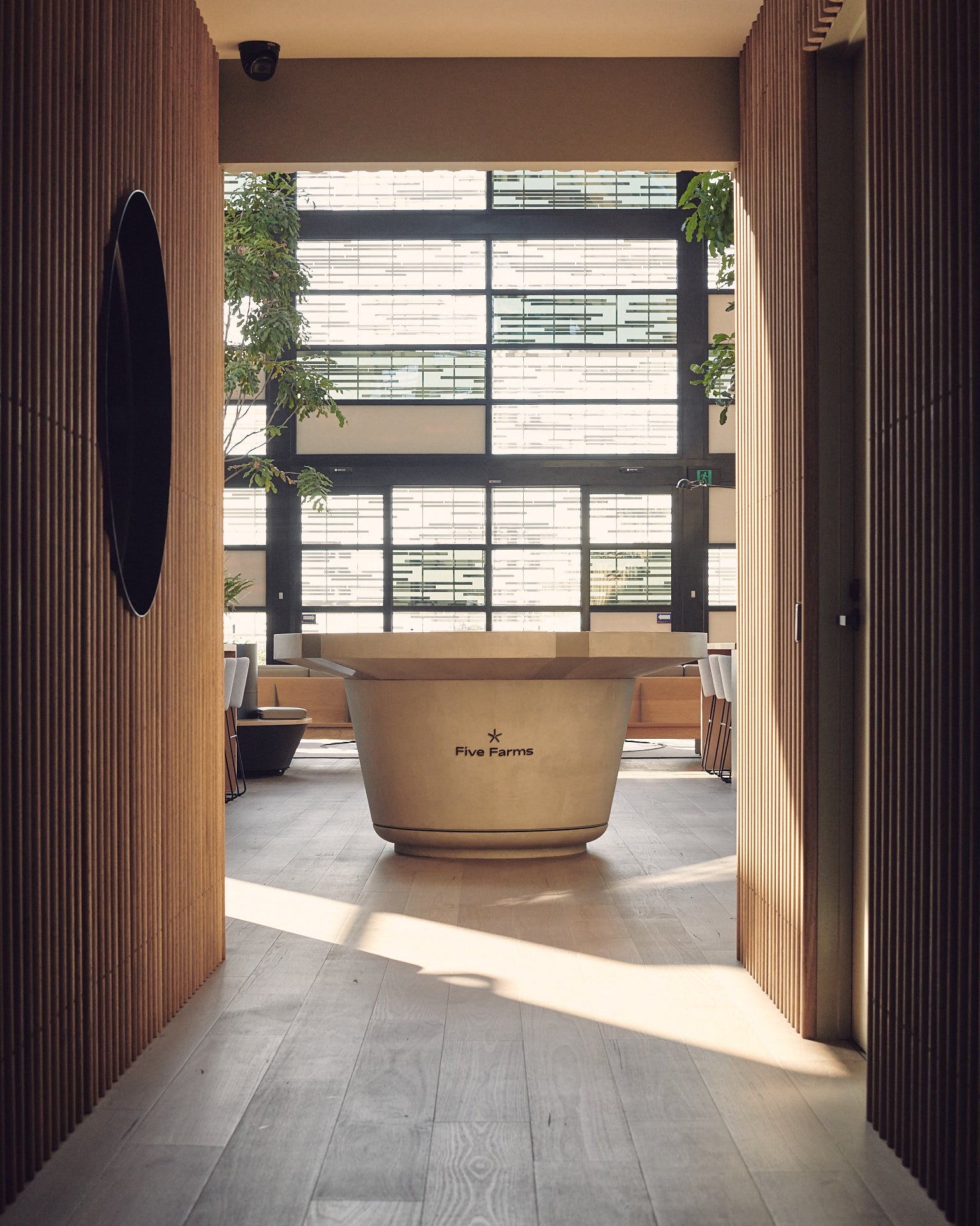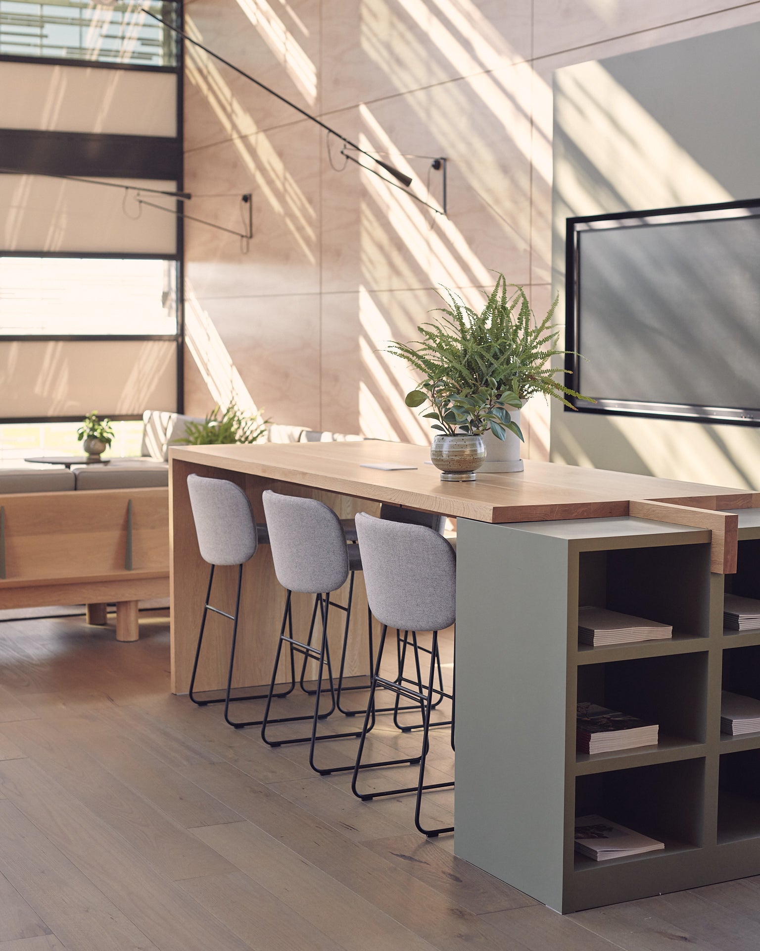 Natural timbers, soft neutral upholstery, and subtle green tones work together to create a sense of ease and longevity. Vertical timber battens and layered joinery elements reference the agricultural context of Five Farms, while custom furniture and integrated seating zones encourage conversation, pause, and connection.