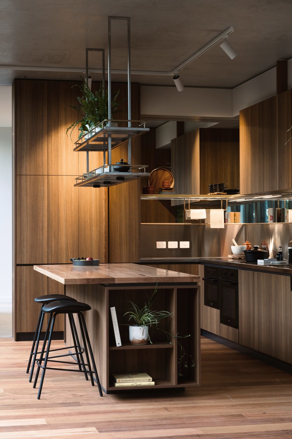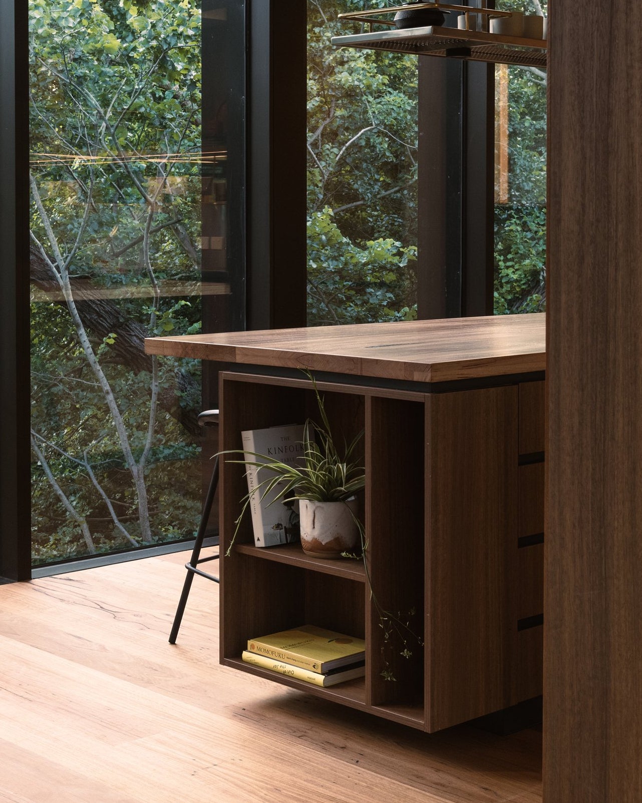 Positioned alongside the natural environment of Merri Creek, the interior draws heavily from its surroundings. Warm timber joinery, muted natural tones, and tactile materials create a sense of warmth and permanence, while expansive glazing frames views to the trees beyond, allowing light and landscape to become integral parts of the experience.